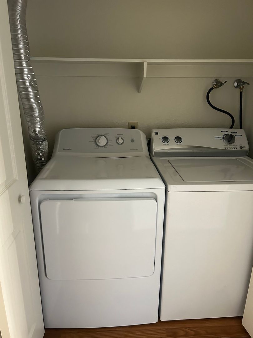 Located along the outer edge of the property facing the cul-de-sac, this apartment has a more independent feel yet is in very close proximity to all amenities. Upon entry, the kitchen, dining, and living room areas are presented as an open floor plan providing an abundance of natural light and convenience for entertaining. A spacious and private patio is accessible from the dining area and is perfect for grilling, tending to plants, or enjoying the fresh air. The wood-burning fireplace in the living room adds character and provides cozy heat during the colder months. The first bedroom is located at the start of the hallway. A full bathroom and laundry closet with a full-size washer and dryer are all located along the hallway. The master bedroom is located at the end of the hallway and offers a walk-in closet and a second full-size bathroom.